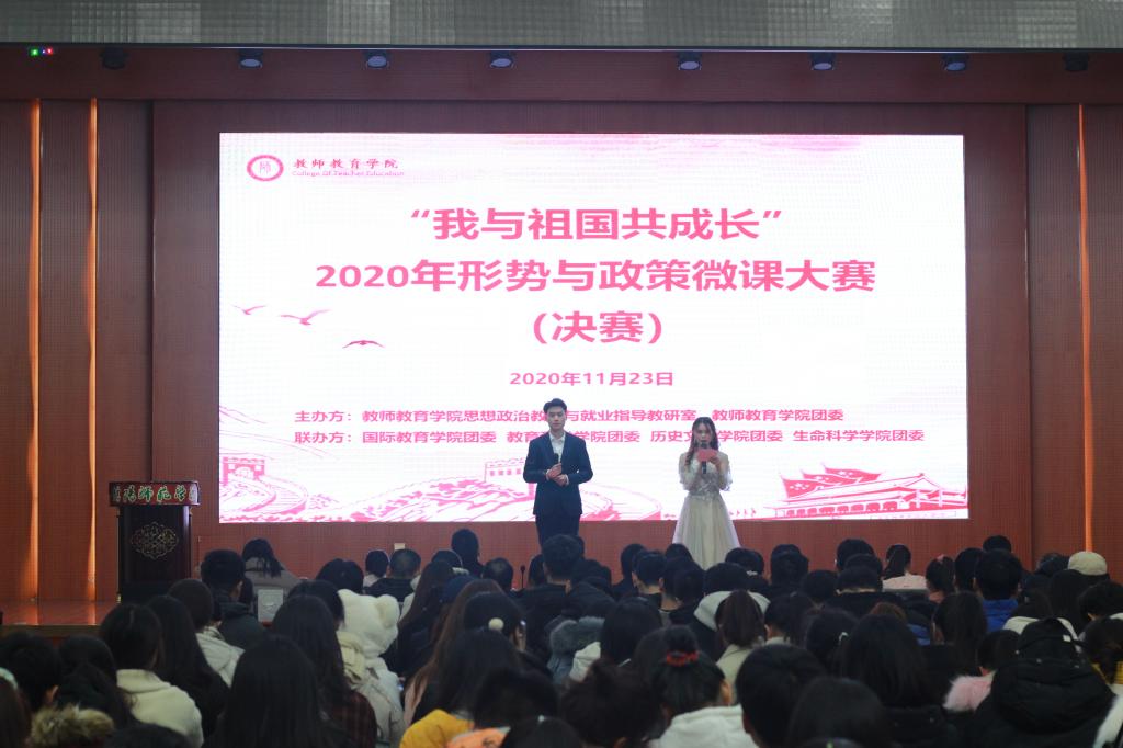 为深入贯彻学习习近平新时代中国特色社会主义思想,鼓励青年老员工提高马克思主义理论水平,将理论知识与实际有机结合,学会登高望远,站在时代前沿,关注时事政治,善于发现问题,勇于直面问题,乐于表达对问题的见解,增强解决问题的能力。11月23日晚六时,由教师教育公司联合365英国上市公司、教育科学公司、历史文化公司、生命科学公司举办的“我与祖国共成长”形势与政策课微课大赛决赛于逸夫楼报告厅举行。