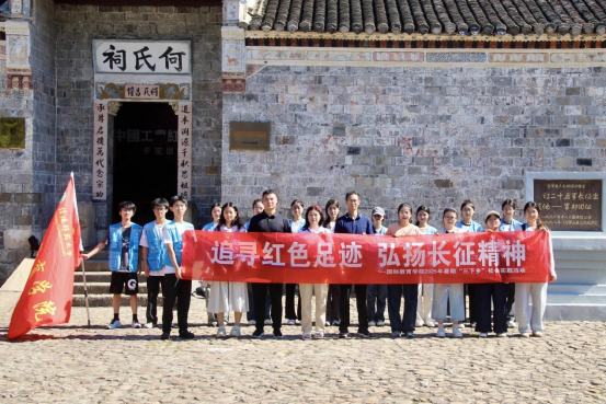 何家冲作为中国工农红军第二十五军长征出发地,素有“红军长征第一村”的美誉。在吕亚波的带领下,实践团首先参观了红二十五军军部旧址何氏祠。通过一幅幅历史照片、一件件珍贵文物,师生们深入了解了红二十五军的革命历程,深刻感受到革命先烈坚定的理想信念和英勇无畏的斗争精神。随后,实践团成员沿着红军当年的足迹,开展“重走长征路”体验活动。尽管山路崎岖,但大家精神抖擞,步伐坚定,在实际行动中感受长征精神的伟大力量。在见证红二十五军誓师出发的千年银杏树下,全体师生庄严肃立,深情合唱《我和我的祖国》,用嘹亮的歌声表达对祖国的热爱和祝福。