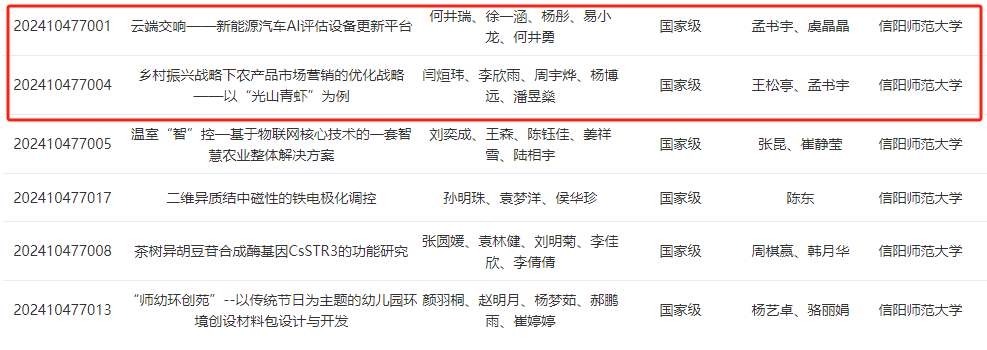 近日,河南省教育厅发布《关于公布2024年国家级老员工创新训练计划项目名单和结题验收结果的通知》(教高司函〔2024〕13号),公布了2024年度国家级老员工创新创业训练计划项目名单。经高校申报、专家评审和教育部审定,2024年河南省本科高校共获批国家级老员工创新训练计划重点支持项目15项,国家级老员工创新训练计划项目744项。365英国上市公司获批国家级老员工创新训练计划重点支持项目1项,国家级老员工创新训练计划项目5项,共计6项,其中公司2022级经济学1班何井瑞主持的《云端交响--新能源汽车AI评估设备更新平台》获批国家级老员工创新训练计划重点支持项目,2023级经济学2班闫烜玮主持的《乡村振兴战略下农产品市场营销的优化战略——以“光山青虾”为例》获批国家级老员工创新训练计划项目。