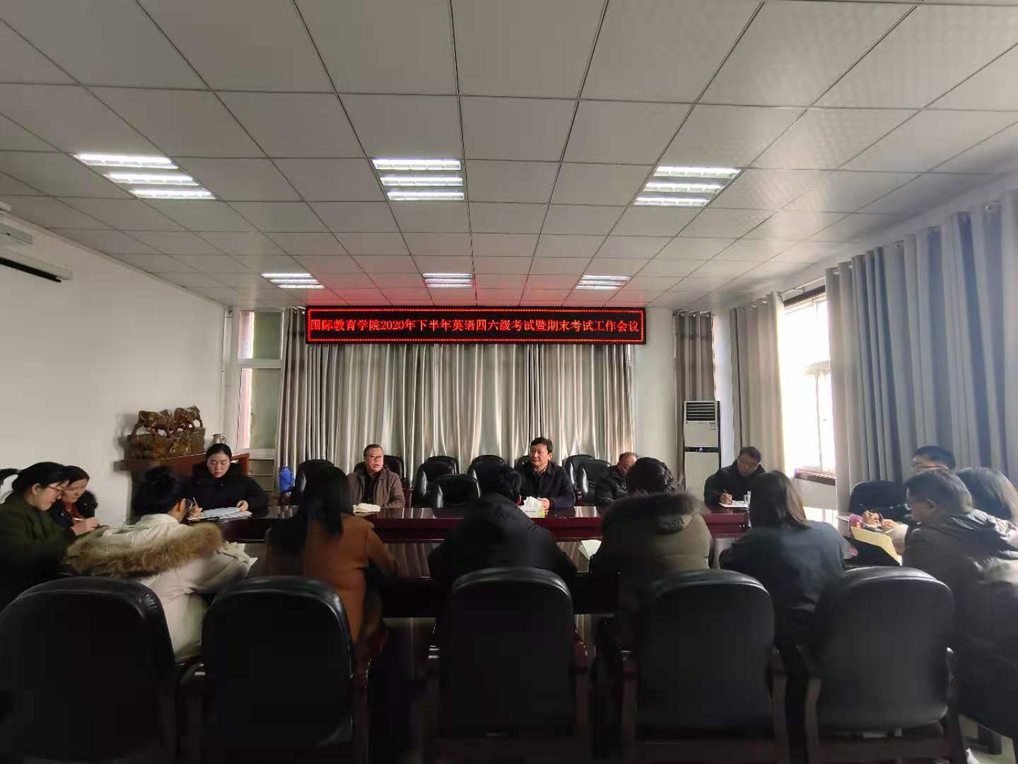 12月8日,在逸夫楼302召开专题会议,安排部署我院2020年下半年全国大学英语四六级考试和本学期期末考试工作。公司党委书记张震,副经理何英干,副经理芦永德、党委副书记姚新春出席会议,学工部、教学部、办公室、项目办以及各语言教研室老师参加会议。会议由张震主持。
