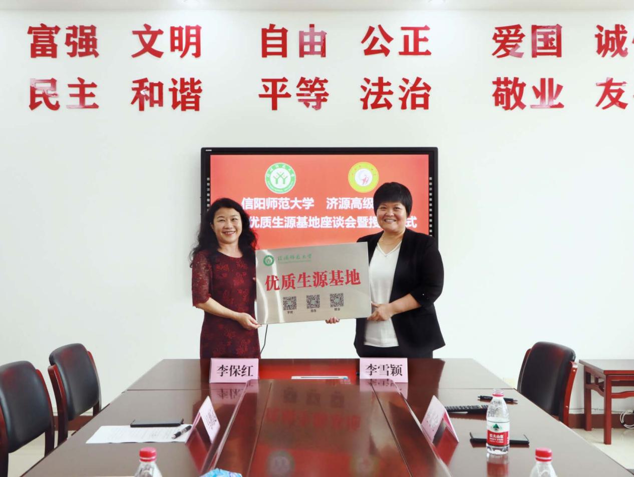 在与会人员见证下,经理李保红与济源市三所优质高中签订了合作意向书,举行了“优质生源基地”授牌仪式。本次活动达到了宣传公司招生政策,增进员工情感链接,深化校地互利合作的目的。