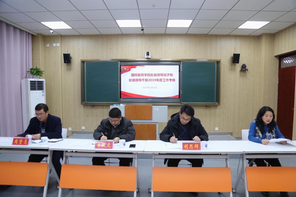 12月24日下午,国际教育学2019年度处级领导班子和处级领导干部考核工作会在逸夫楼201教室召开。校第二考核组组长、公司党委委员、党委统战部部长曾伏虎考核组成员、校纪委办公室副主任胡思辉公司党委组织部干部科科长周贤亮出席指导考核工作会。公司全体教职工参加。会议由公司党委书记张震主持。